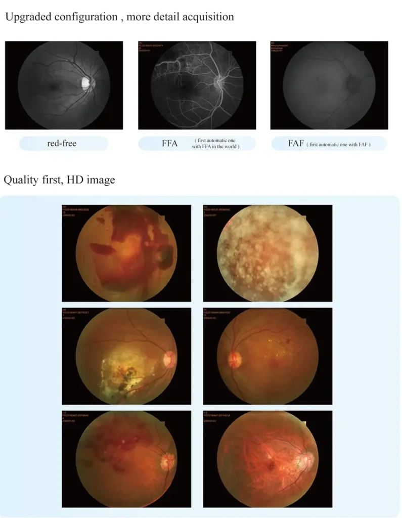 Acquisition ModesNon-mydriatic / Mydriatic, Anterior Photography, Red-free (optional), FFA (optional), FAF (optional)