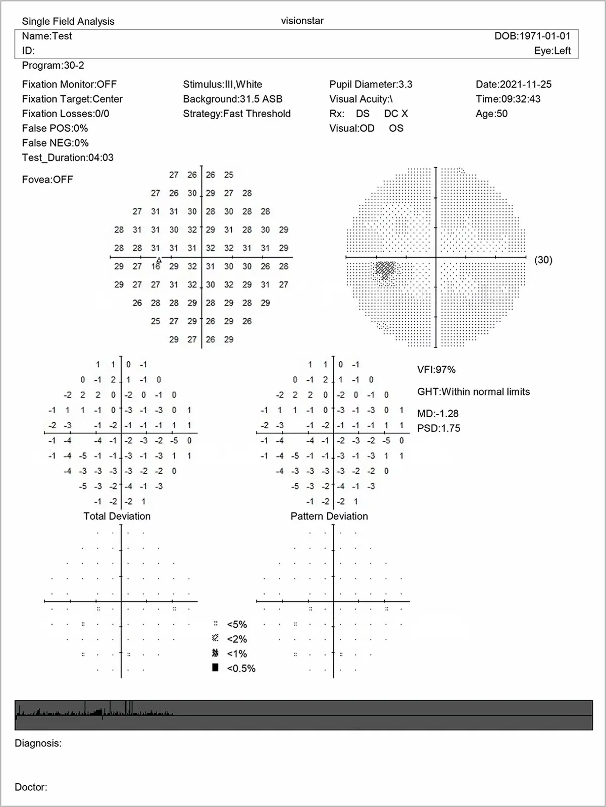 | Threshold test model | Center 5°–16, center 10°–68, 24°–2, 30°–2, 30°–60° nasal step |