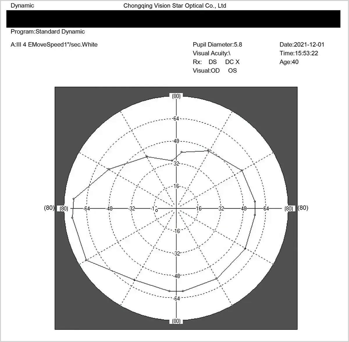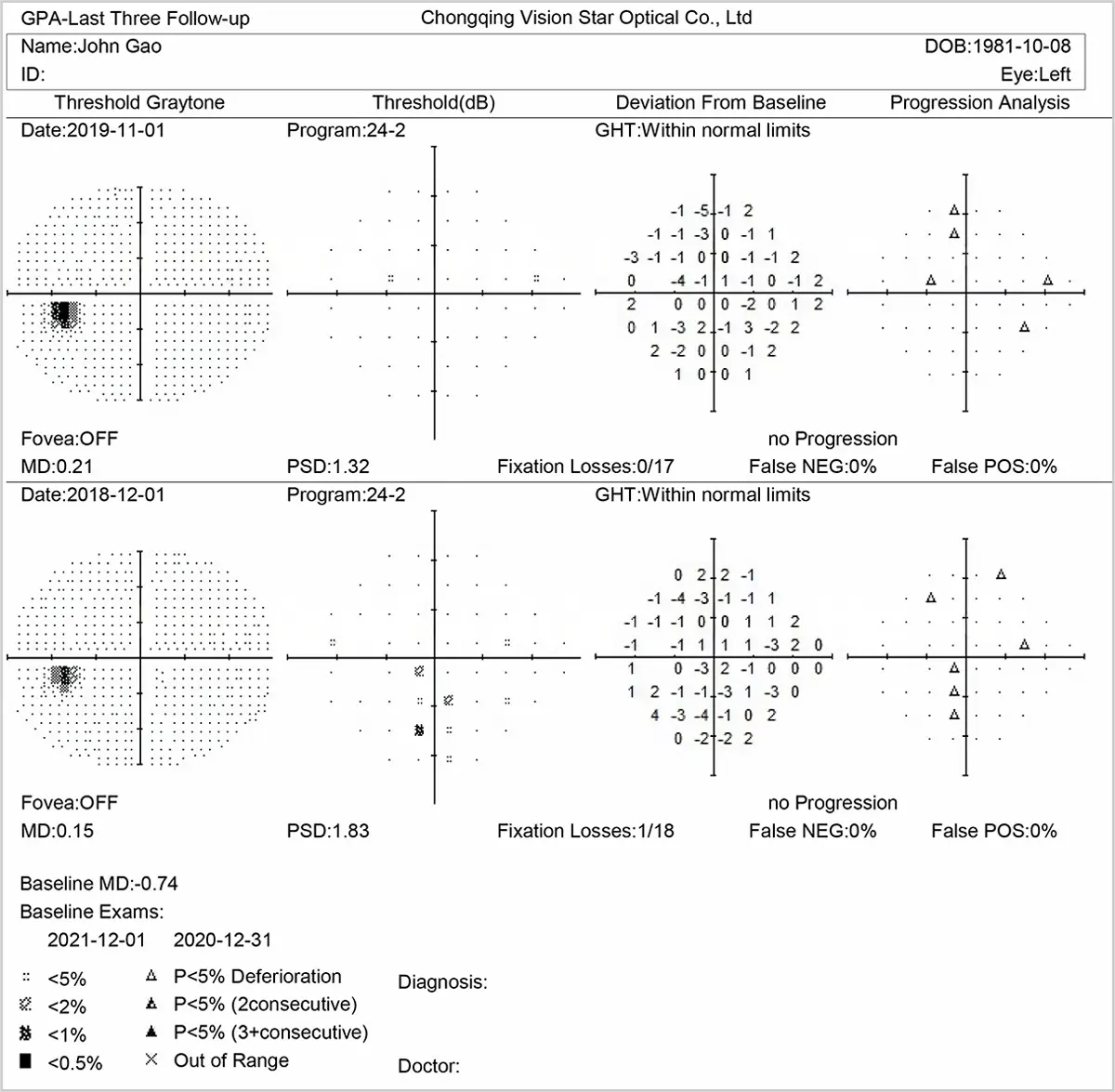 Analysis softwareReliability analysis, single report, triple report, GHT glaucoma semi vision report, GPA glaucoma developing analysis, VFI analysis, Blue-yellow analysis